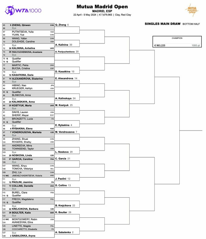 В основній сітці тисячника у столиці Іспанії виступлять 5 представниць України: Еліна Світоліна, Марта Костюк, Даяна Ястремська, Ангеліна Калініна та Леся Цуренко. Тільки Леся почне грати в Мадриді з першого раунду, інші українки стартують з 1/32 фіналу.