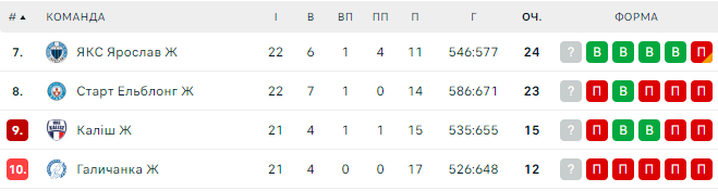 Галичанка займає останню, 10-ту позицію у пульці за 7–10 місця, маючи 12 очок (4 перемоги та 17 поразок).
