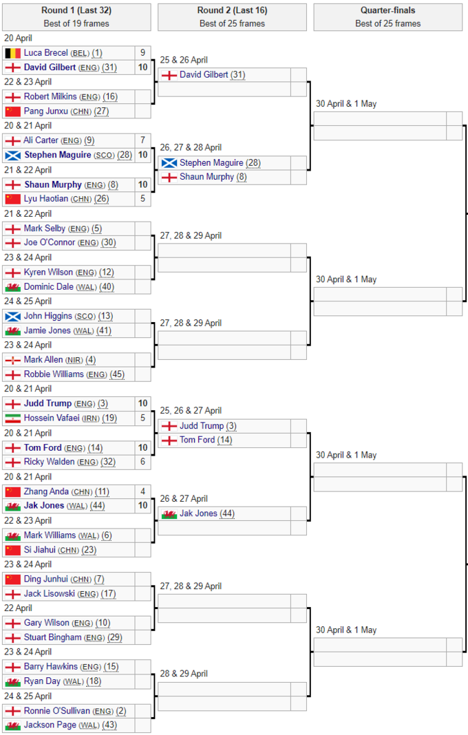 Тим часом, 4-разовий чемпіон світу Марк Селбі перебуває на межі поразки в матчі 1-го раунду, поступившись Джо О'Коннору в першій сесії з рахунком 2:7.