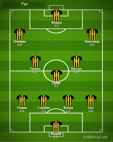 «Рух»: Ледвій – Слюбик, Холод, Сич, Роман – Дідик (Карабін, 70), Пастух, Таллес – Квасниця, Плюман (Руніч, 70) – Федор.
