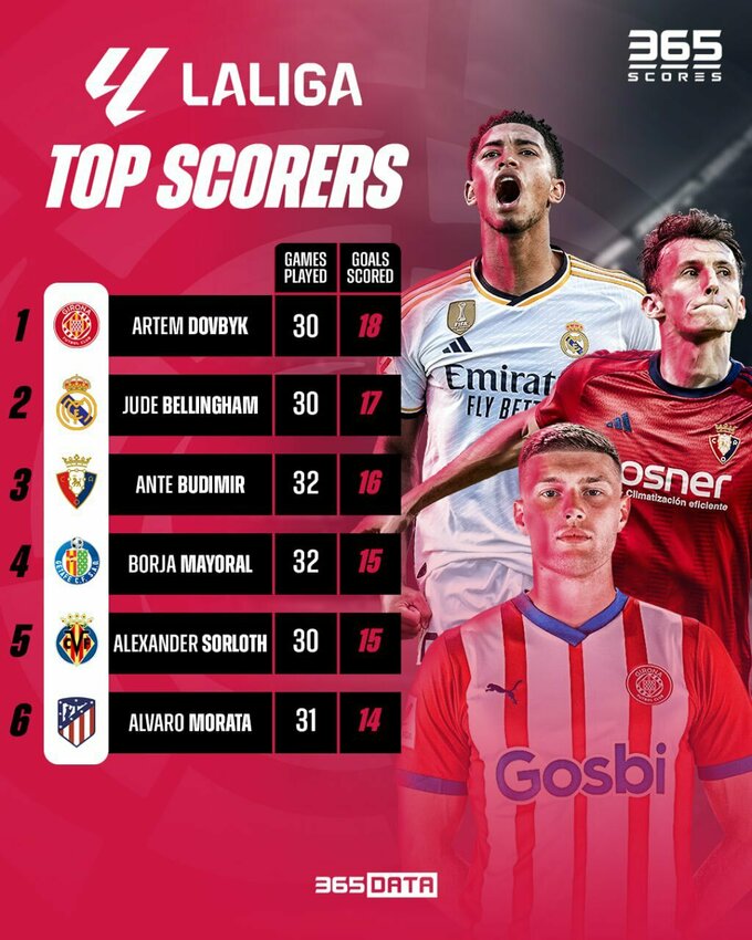 26-річний нападник «Жирони» Артем Довбик забив у цьому сезоні Ла Ліги 18 голів та очолює бомбардирську гонку іспанського чемпіонату, випереджаючи Джуда Беллінгема з «Реала» на один гол та Анте Будіміра з «Осасуни» - на два.