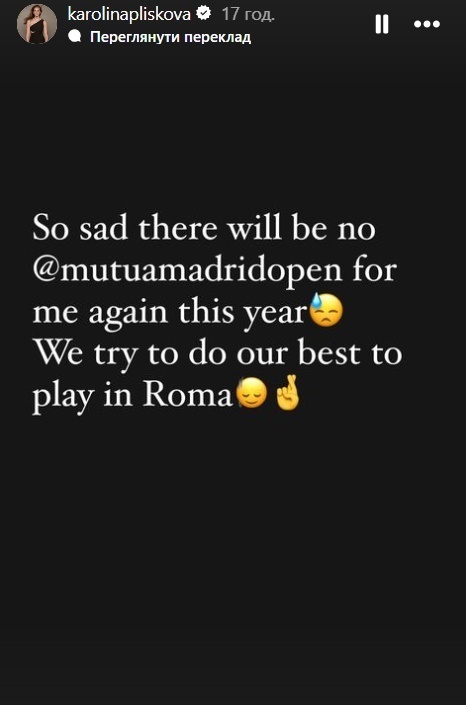 «Так сумно, що цього року я знову пропущу турнір у Мадриді. Ми робимо все можливе, щоб зіграти в Римі», – написала Плішкова в інстаграмі.