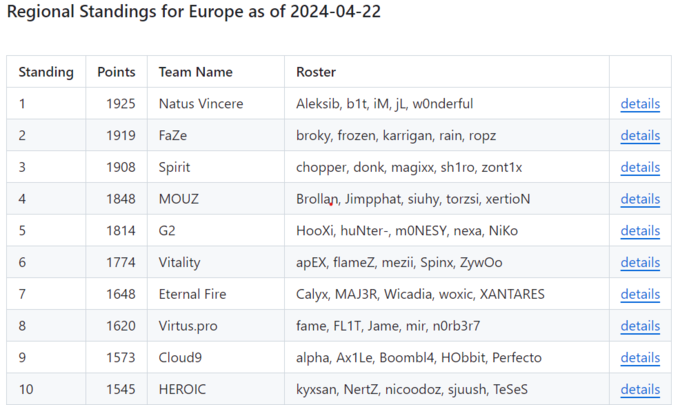 Компанія Valve оновила свої регіональні рейтинги команд з CS2. У Європі на першому місці розташувалася українська кіберспортивна організація Natus Vincere (NAVI), у яких 1925 очок, друге місце займає FaZe Clan (1919). Топ-3 замикає команда Team Spirit (1908).