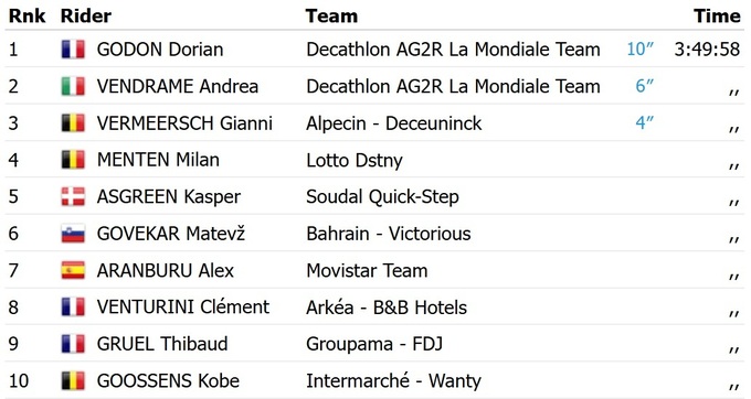 У фінішному спринті на першому етапі Годон випередив партнера по команді, італійця Андреа Вендраме, і бельгійця Джанні Вермеерша з «Alpecin Deceuninck».