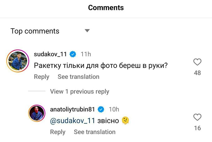 21-річний українець Георгій Судаков, який разом із Трубіним виступав за донецький «Шахтар», вирішив потролити Анатолія у коментарях до його публікації: