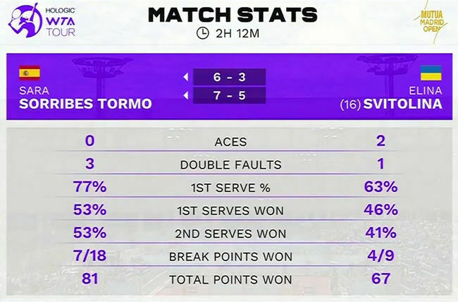 Еліна Світоліна (Україна) – Сара Соррібес Тормо (Іспанія) – 3:6, 5:7