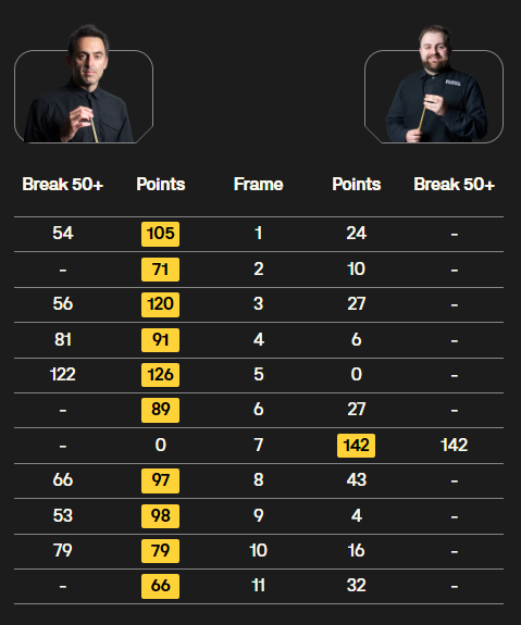 Брейки в 54, 52, 81, 122, 66 і 53 допомогли О'Саллівану здобути перевагу 8:1 у першій сесії в середу. А в четвер, 25 квітня, Ронні зробив серію 79 очок у 10-му фреймі, а потім завершив матч у 11-му фреймі.