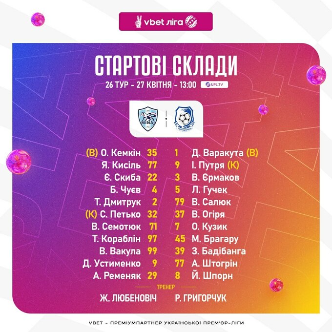 Запасні: Білик, Вічний, Присяжнюк, Арсич, Голуб, Ситников.