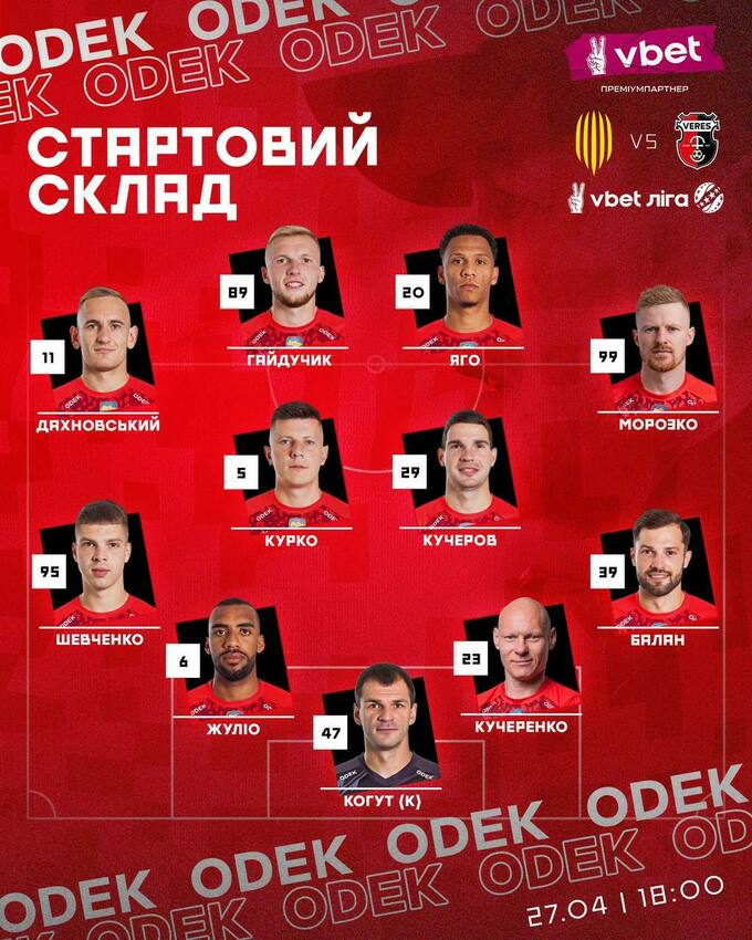 «Верес»: Когут – Шевченко (Шарай, 68), Жуліо Сезар, Кучеренко, Балан – Курко, Кучеров – Дахновський (Шастал, 68), Яго (Годя, 74), Морозко – Гайдучик (Сміян, 80).