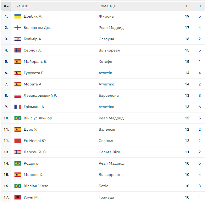 Для українського бомбардира це 19-й гол цього сезону Ла Ліги, що дозволяє гравцеві відірватися від зіркового хавбека Реала Джуда Беллінгема, у якого залишилося 17 точних ударів.