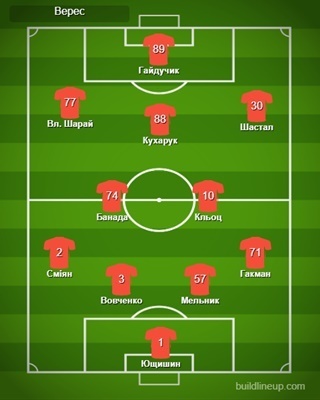 «Верес»: Ющишин – Гакман, Мельник, Вовченко, Сміян, Банада, Кльоц (Кучеров, 67), Кухарук (Кучеренко, 67), Шастал (Дахновський, 46), Шарай (Шестаков, 71), Гайдучик (Світюха, 79).