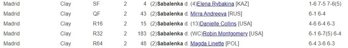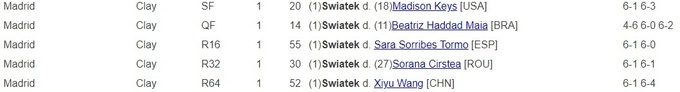 Перша ракетка світу Іга Свьонтек на шляху до фіналу турніру WTA 1000 у Мадриді програла лише 20 геймів у п'яти матчах. Загальний час на корті – 7 годин 20 хвилин, у середньому 1 година і 28 хвилин.
