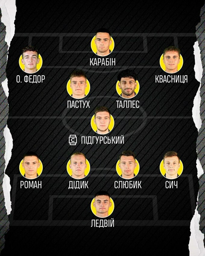 «Рух»: Ледвій – Роман, Дідик, Слюбик, Сич – Пастух, Підгурський, Таллес (Притула, 90+1) – Федор (Руніч, 46), Карабін (Теслюк, 85), Квасниця (Плюман, 76).