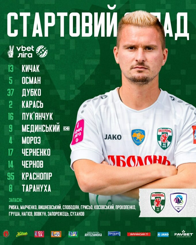 Потрійна заміна у складі Оболоні. Замість Мороза, Таранухи та Прокопенка гратимуть Косовський, Вишневський та Грисьо.