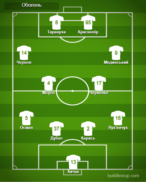 «Оболонь»: Кичак – Осман, Дубко, Карась, Лук'янчук – Черненко, Мединський, Мороз (Косовський, 64), Чернов (Прокопенко, 54, Грисьо, 64) – Тарануха (Вишневський, 64), Краснопір (Суханов, 90).