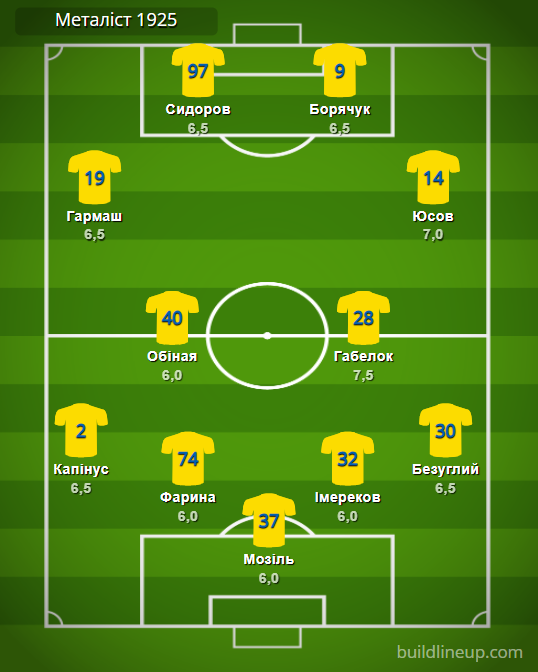 «Металіст 1925»: Мозіль – Капінус, Фарина, Імереков, Безуглий – Обіная, Габелок (Вачіберадзе, 90+2) – Гармаш (Курило, 90+2), Юсов (Арі, 81) – Сидоров (Бичек, 73), Борячук (Фрімпонг, 73).