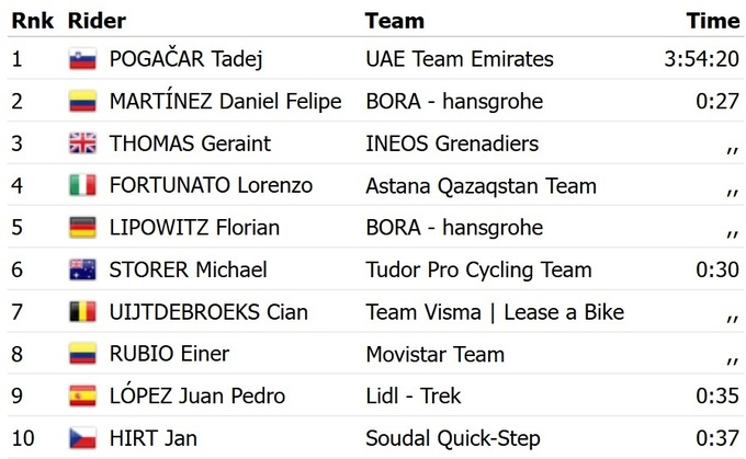 Це його перша перемога на нинішній Джиро. Погачар завдяки цьому успіху перехопив рожеву майку лідера загального заліку.