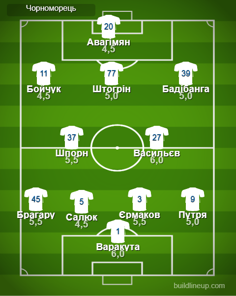 «Чорноморець»: Варакута - Путря, Салюк (Гучек, 63), Єрмаков, Брагару - Шпорн, Васильєв (Присяжнюк, 79) - Бадібанга, Штогрін, Бойчук (О. Кузик, 46) - Авагімян (Ієде, 63)