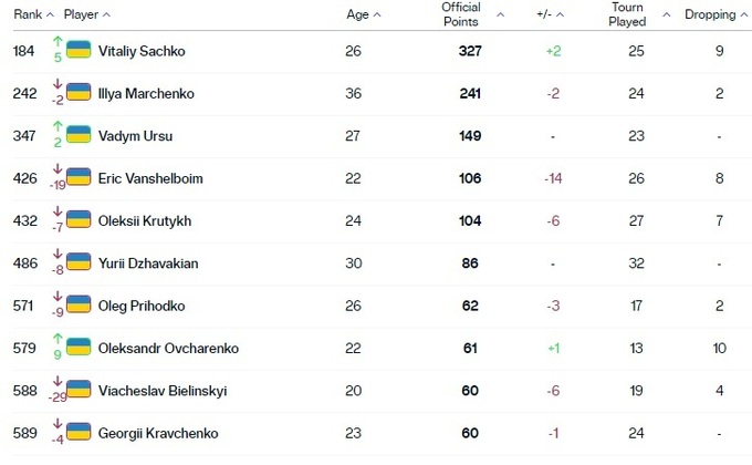 Щодо українців, то Віталій Сачко покращив своє становище на 5 місць, Олександр Овчаренко – на 9, Вадим Урсу – на 2, вкотре оновивши особисте досягнення в рейтингу. Ілля Марченко, Ерік Ваншельбойм, Олексій Крутих, Юрій Джавакян, В'ячеслав Белінський та Георгій Кравченко опустилися.