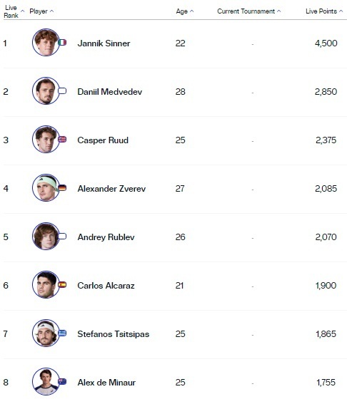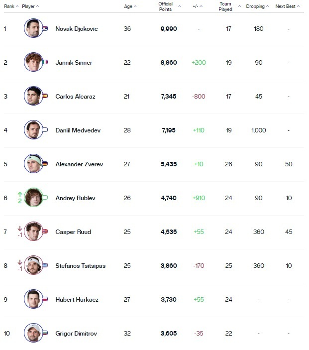 У Чемпіонській гонці Яннік Сіннер продовжує лідирувати з величезним відривом. Рубльов після перемоги в Мадриді увірвався до топ-8, Новак Джокович тільки 12-й.