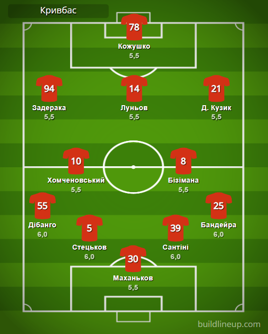 «Кривбас»: Маханьков – Дібанго, Стецьков, Сантіні (Бескоровайний, 68), Бандейра – Хомченовський (Твердохліб, 63), Бізімана – Задерака (Соса, 62), Луньов (Татарков, 77), Д. Кузик (Понєдєльнік, 63) – Кожушко.