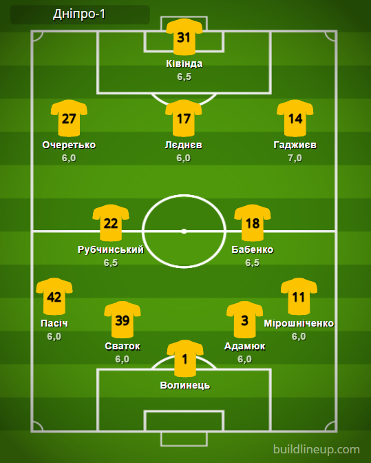 «Дніпро-1»: Волинець – Пасіч, Сваток, Адамюк, Мірошніченко – Рубчинський, Бабенко – Очеретько, Лєднєв (Когут, 86), Гаджиєв (Третьяков, 75) – Ківінда (Філіппов, 75).