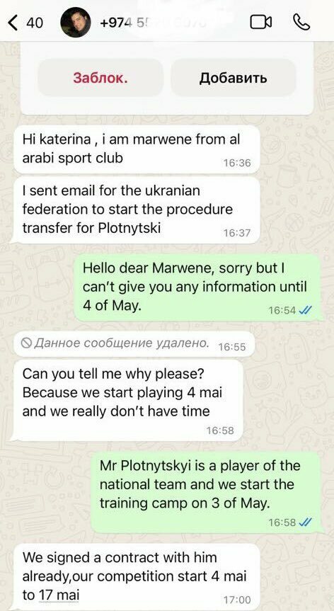У ФВУ, за інформацією Sport.ua, видавати волейболістові трансфер і, відповідно, дозволяти йому не грати в період клубного міжсезоння за збірну категорично відмовилися. Після цього один із менеджерів «Аль-Арабі» запропонував в особистій переписці з представниками ФВУ фантастичну суму за трансфер – 50 000 євро. Для порівняння: сума, яку ФВУ отримує за трансфер Плотницького в італійську «Перуджу», складає 5000 євро. Проте у Федерації волейболу України на гроші арабських шейхів не спокусилися.