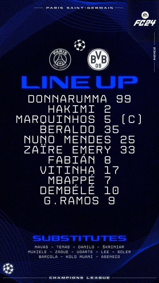 «ПСЖ»: Доннарумма – Мендеш, Бералдо, Маркіньйос, Хакімі – Руїс (Асенсіо, 63), Феррейра, Заїр-Емері (Кан Ін, 76) – Мбаппе, Рамуш (Баркола, 63), Дембеле.