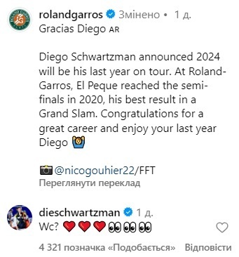 Офіційний акаунт Відкритого чемпіонату Франції опублікував пост, присвячений останньому року Шварцмана в турі, а Дієго його прокоментував:
