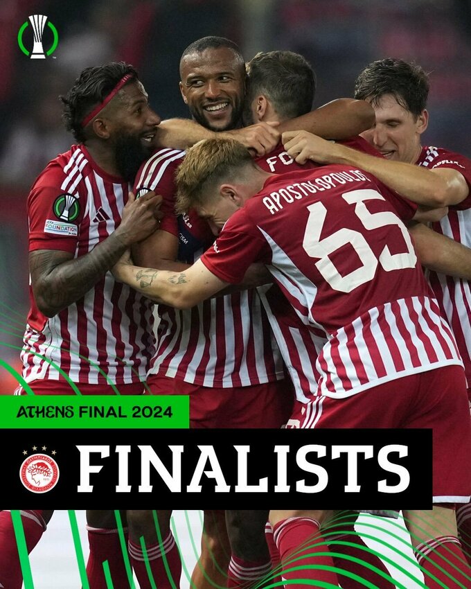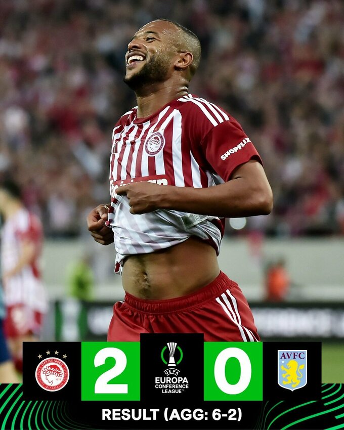 Грецький «Олімпіакос» з міста Пірей вдруге переміг «Астон Віллу» (4:2, 2:0) та вийшов у домашній фінал Ліги конференцій, який пройде в Афінах, столиці Греції.