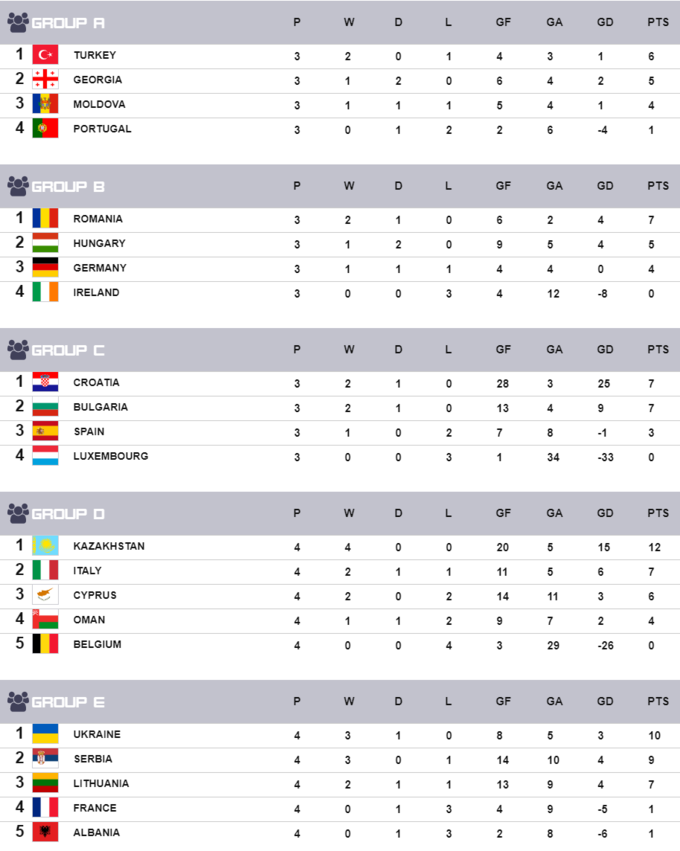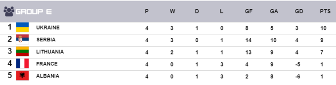Збірна України виграла групу E, набравши 10 очок з 12. Також із цієї групи в плей-оф вийшли команди Сербії (9) та Литви (7). Додому вирушають команди Франції та Албанії (по 1).