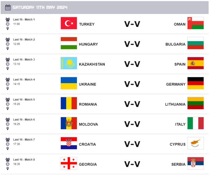 Переможець вийде до 1/4 фіналу на найкращого у протистоянні Казахстану та Іспанії. Чвертьфінали пройдуть увечері 11 травня, а півфінали та фінали – 12 травня.