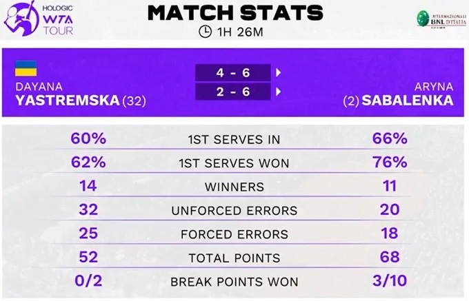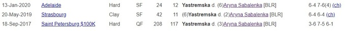 Даяна Ястремська (Україна) – Аріна Соболенко – 4:6, 2:6