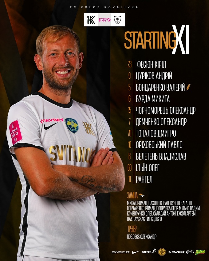 «Колос»: Фесюн – Цуріков, Чорноморець (Гончаренко, 72), Бондаренко, Бурда – Топалов, Демченко, Оріховський (Криворучко, 72), Ільїн (Салабай, 73) – Рангел (Паулаускас, 86), Велетень (Гусол, 85).