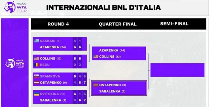 У чвертьфіналі тисячника у Римі Соболенко зіграє проти Альони Остапенко (Латвія, WTA 10), яка посіяна під 9-м номером. Остапенко у столиці Італії грає в одній парі із ще однією представницею України Людмилою Кіченок. Українсько-латвійський тандем уже вийшов до 1/4 фіналу турніру.