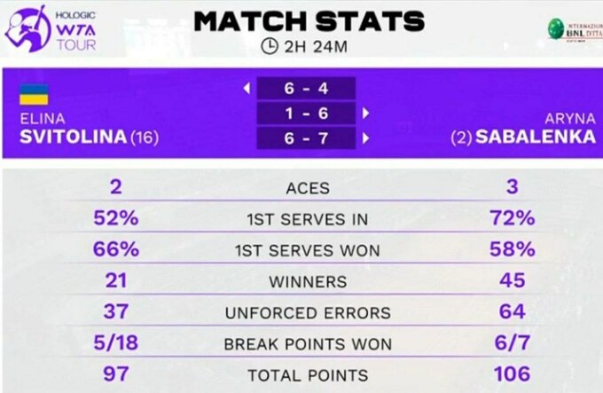 У третьому сеті Еліна повела 2:0, але одразу ж програла 4 гейми поспіль. Соболенко перемагала 5:3 і подавала на матч за рахунку 5:4, проте Еліна під нуль взяла 10-й гейм на прийомі, в 11-му відіграла прихований матчбол. У 12-му українка втратила 2 матчі-пойнти. На тай-брейку Еліна також мала матчбол на прийомі за 7:6, але програла 3 очки поспіль.