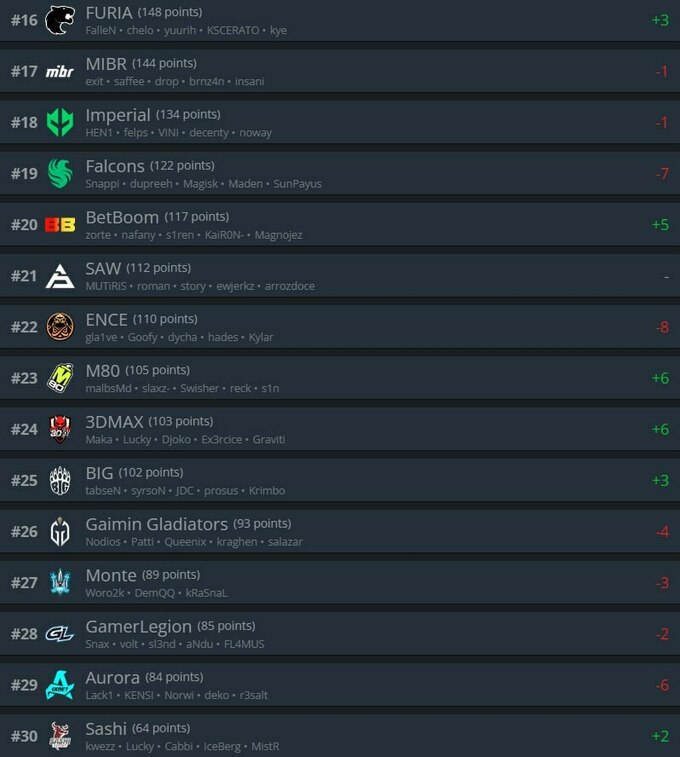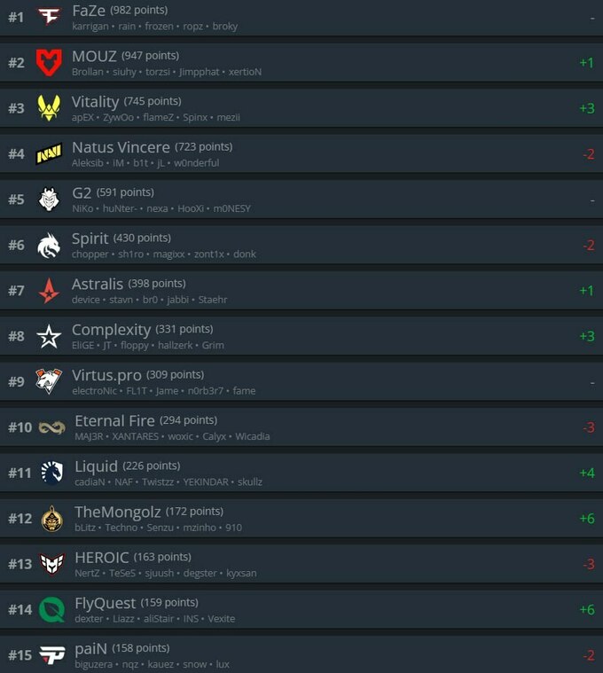 Рейтинг очолює FaZe Clan. На друге місце піднялася команда MOUZ, третє у Team Vitality.