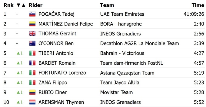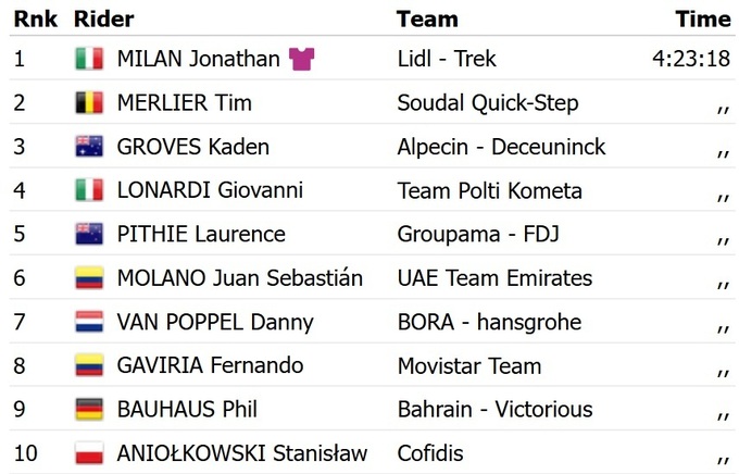 Для Мілана це друга перемога на нинішній Джиро і сумарно третя в кар'єрі. Рожеву майку лідера загального заліку зберіг словенець Тадей Погачар з «UAE Emirates».