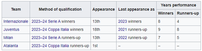 Після тріумфу «Ювентуса» над «Аталантою» (1:0) у фіналі Кубка Італії сезону 2023/2024 визначилися пари 1/2 фіналу Суперкубку Італії.