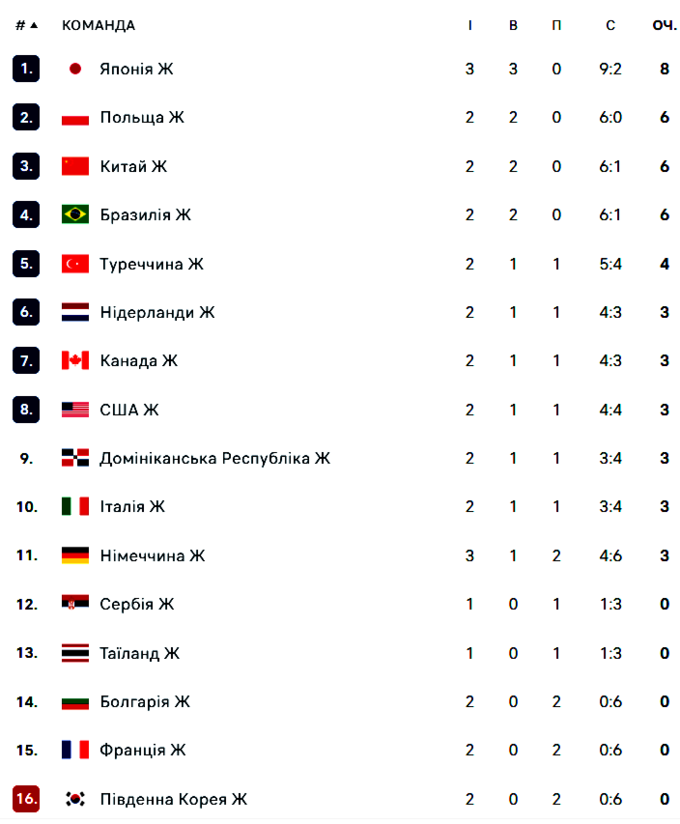 Чудово підготувалися до ігор стартового туру волейболістки Японії. Вони провели три матчі і всі виграли – два з рахунком 3:0 та один 3:2. Набравши 8 очок, ця збірна очолює загальну турнірну таблицю.