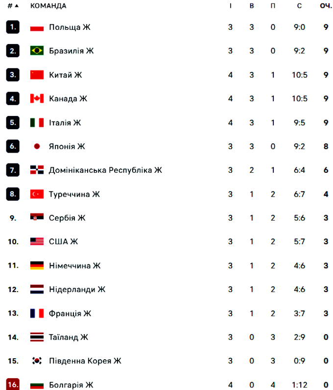 Також три перемоги у збірної Японії, але вона одну зустріч завершила у п'яти партіях і тому має 8 очок.