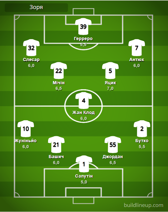 «Зоря»: Сапутін – Жуніньйо, Башич (Хахльов, 46), Джордан, Бутко – Мічін (Головкін, 65), Жан Клод, Яцик (Чурко, 88) – Слесар (Ндур, 66, Горбач, 80), Герреро, Антюх.