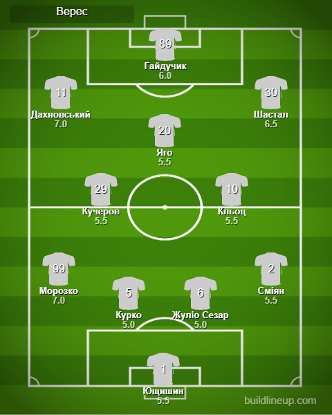 «Верес»: Ющишин (Когут, 29) – Морозко, Курко, Жуліо Сезар, Сміян – Кучеров, Кльоц (Шарай В., 42), Яго – Шастал, Дахновський (Банада, 72), Гайдучик (Мрвальєвич, 72).