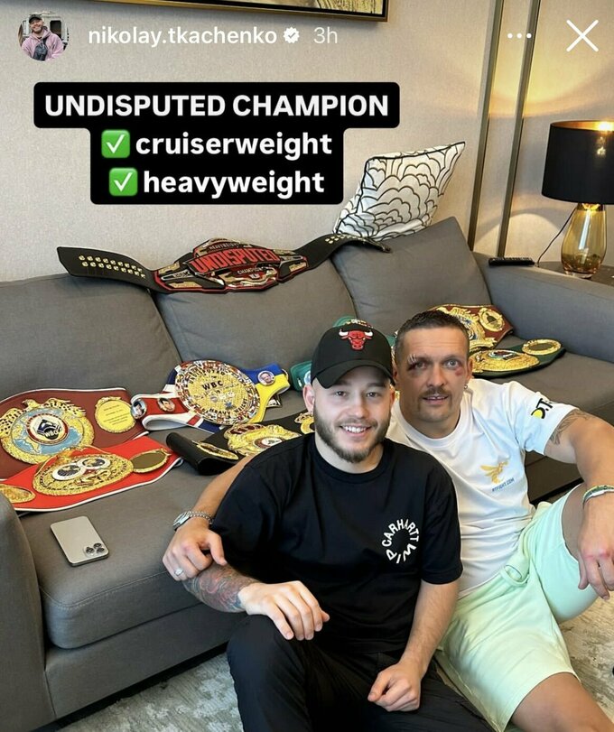 Представник команди Усика Микола Ткаченко у соціальних мережах поділився фотографією з українським боксером та головними чемпіонськими титулами у хевівейті.