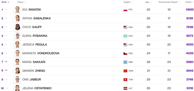 У Чемпіонській гонці Аріна Соболенко обійшла Єлену Рибакіну, а Альона Остапенко повернулася до топ-8.