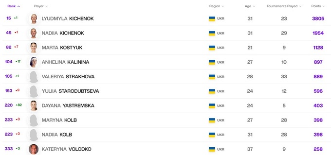 У парному рейтингу Людмила Кіченок повернулася до топ-15, непогано додали Даяна Ястремська та Ангеліна Калініна. Надія Кіченок і Марта Костюк завершили ці два тижні зі знаком «мінус».