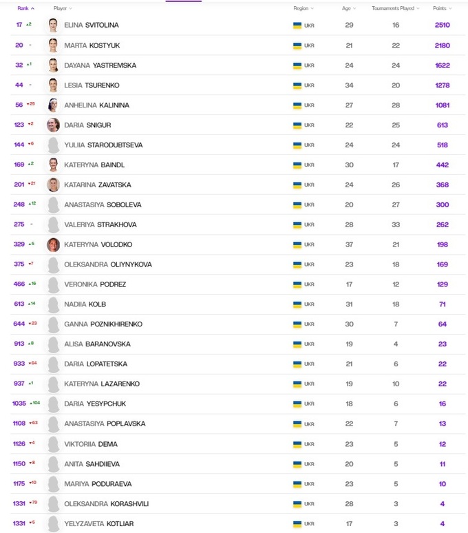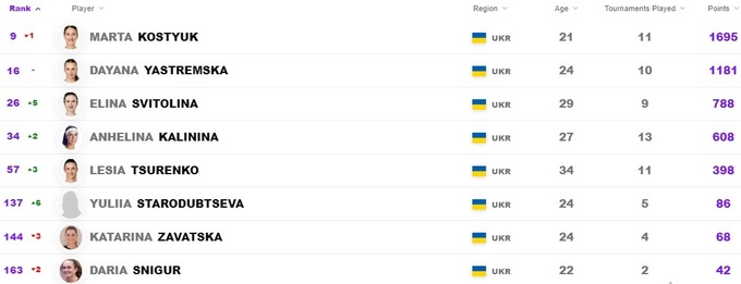 Марта Костюк опустилася на 9-те місце в Чемпіонській гонці, Даяна Ястремська залишилася 16-ю. Світоліна, Калініна, Цуренко і Стародубцева поліпшили своє становище. Завацька та Снігур трохи опустилися.