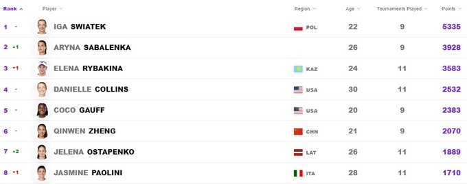 Півфіналістка Даніель Коллінс піднялася на 12-ту сходинку. У першій десятці Марія Саккарі обійшла Чжен Ціньвень.
