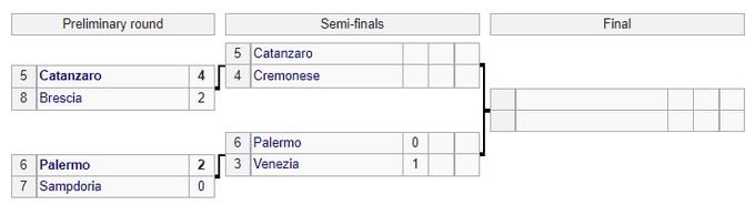 Раніше в 1/4 фіналу Палермо обіграв Сампдорію (2:0), а Катандзаро завдав поразки Брешії (4:2).