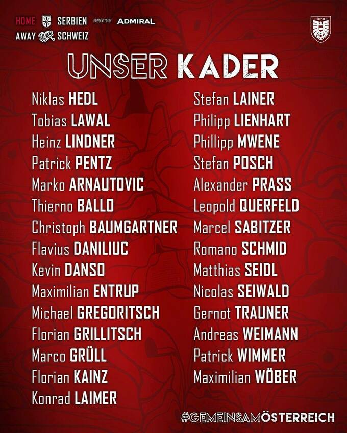 Резерв: Даніель Бахманн (Вотфорд, Англія), Чічан Станкович (АЕК, Греція), Самсон Байду (РБ Зальцбург), Марко Фрідль (Вердер, Німеччина), Мухаммед Чам (Клермон, Франція), Крістоф Ланг (Рапід В), Деян Любічич (Кельн, Німеччина), Манприт Саркарія (Штурм), Кевін Штегер (Бохум, Німеччина), Джуніор Адаму (Фрайбург, Німеччина), Гвідо Бургшталлер (Рапід В), Бенедикт Піхлер (Хольштайн, Німеччина).